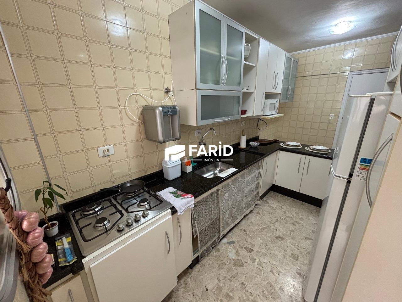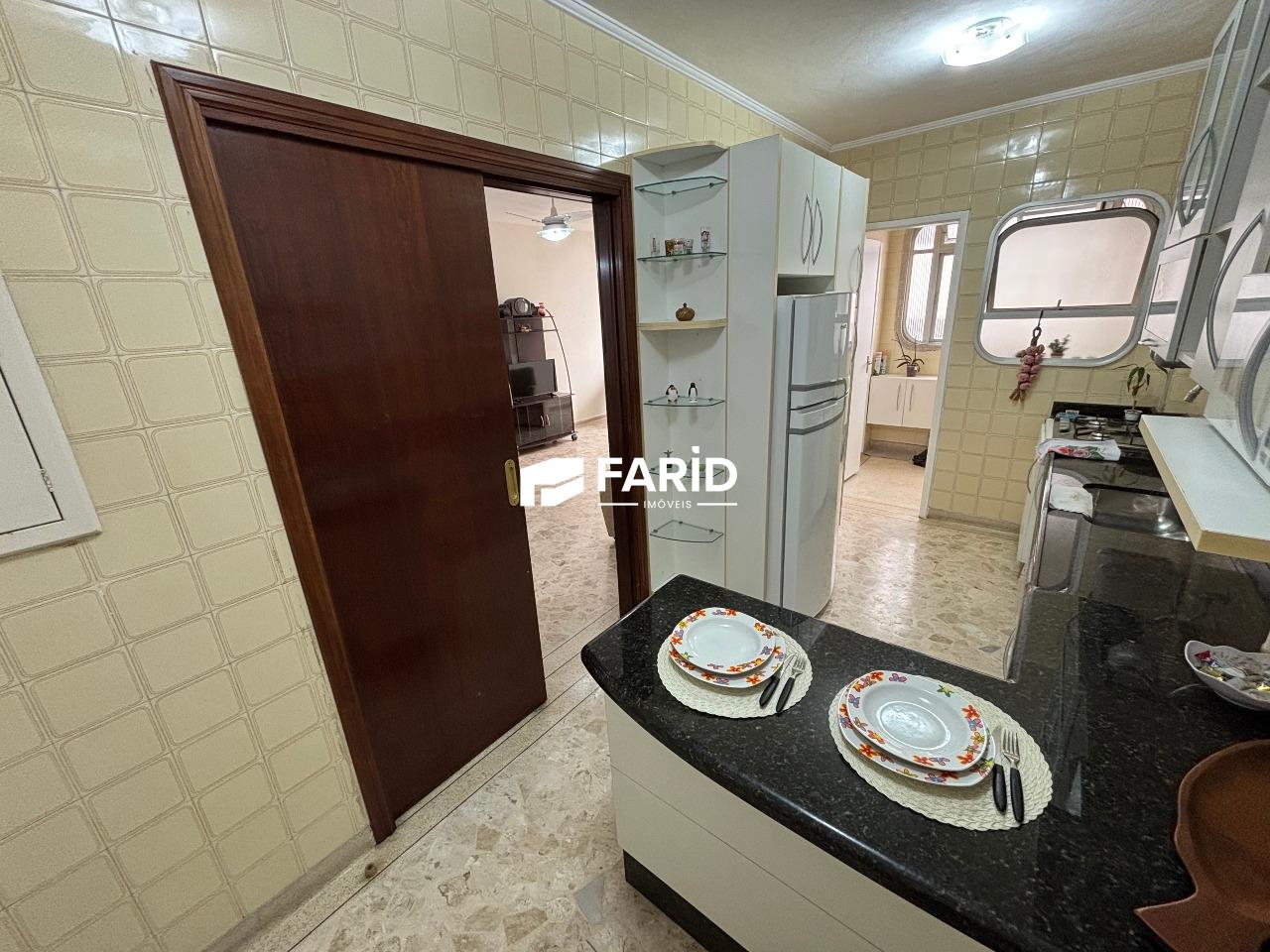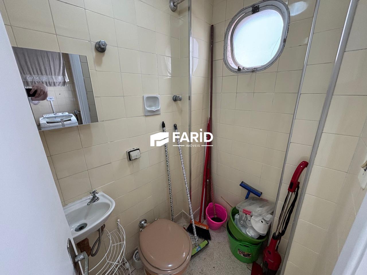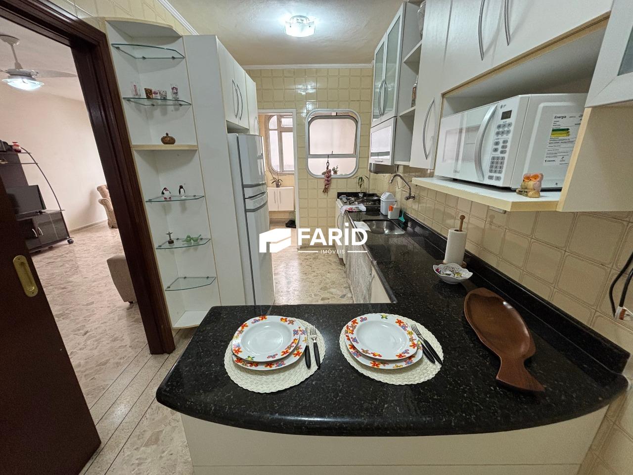 - 1 dormitório, 2 banheiros (social e serviço), cozinha, sala com varanda (e vista ao mar), área de serviço;